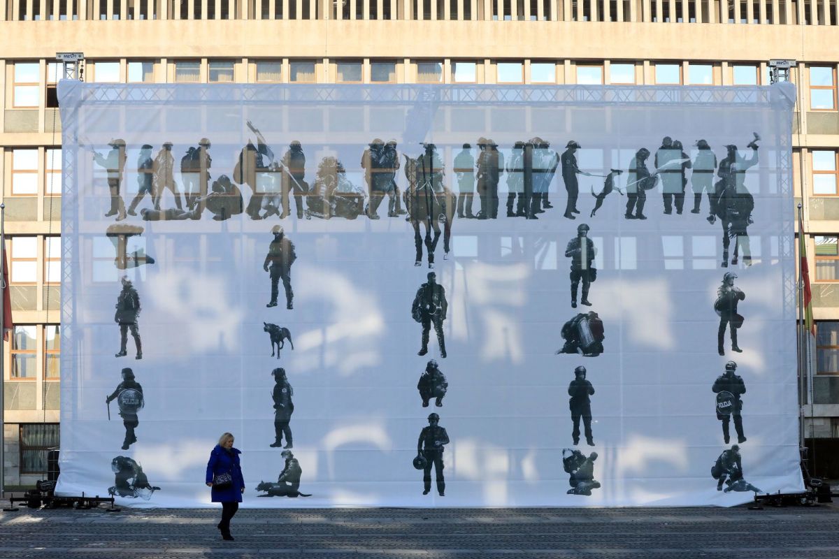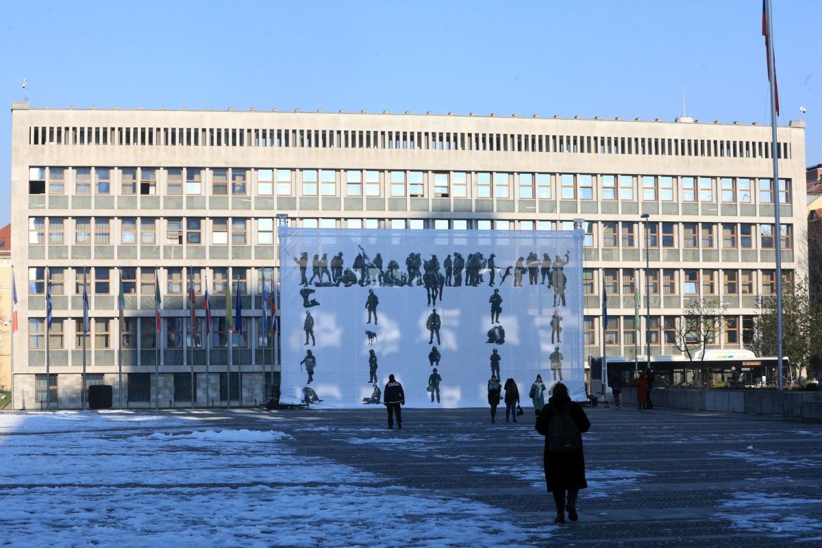 Pred DZ so danes v organizaciji ZRC SAZU postavili platno s pročeljem DZ z liki posebnih policijskih enot. Gre za del projekta Paviljon demokracije, pri katerem sodeluje tudi inštitut za kulturne in spominske študije, tema projekta je povezava med umetnostjo ter civilnodružbenimi gibanji od 80. let 20. stoletja do danes, so zapisali na Twitterju.