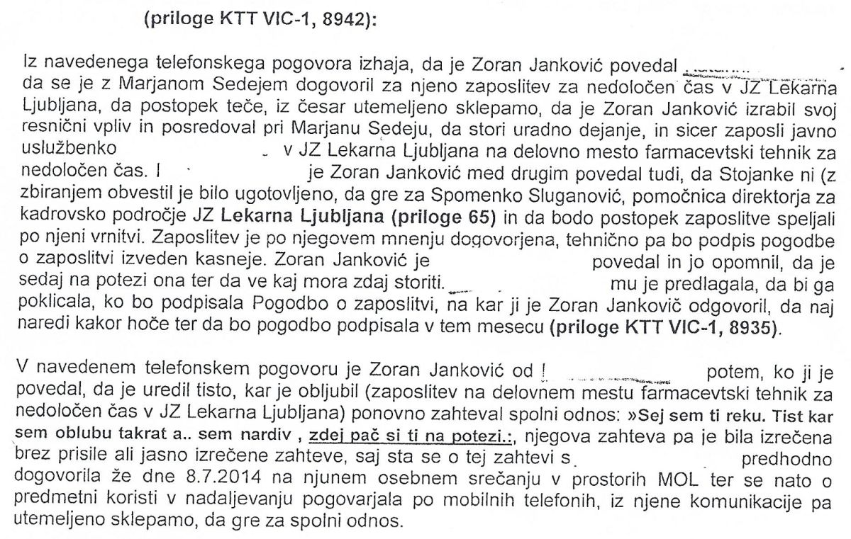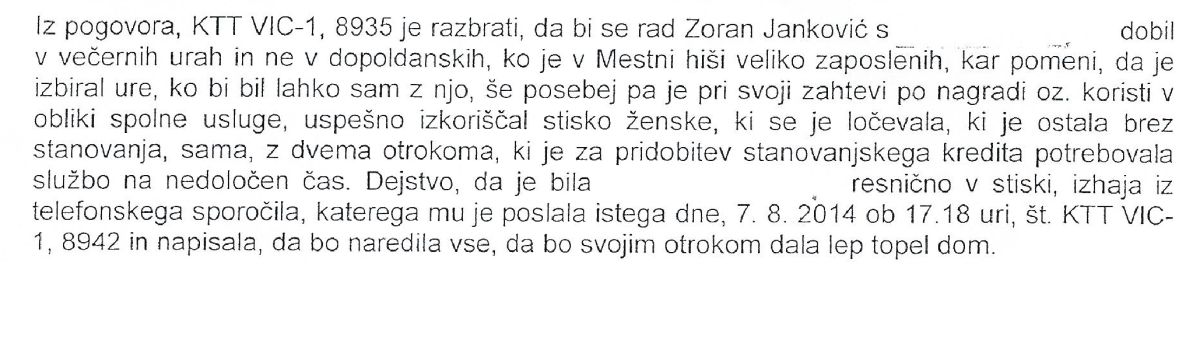 Toda to še zdaleč ni vse, kar mu očitajo na policiji: »Dejstvo, da je bila F. (tako so označili farmacevtko, op. p.) resnično v stiski, izhaja iz telefonskega sporočila, ki mu ga je poslala dne 7. 8. 2014 ob 17:18… in napisala, da bo naredila vse, da bi svojim otrokom dala lep, topel dom«. 12. avgusta 2014 je nato poklicala Jankovića in mu povedala, da je dobila pogodbo o zaposlitvi ter ga vprašala, kdaj lahko pride k njemu, župan jo je večkrat spraševal, ali in kdaj bi prišla k njemu, zdaj, ko je dobila želeno zaposlitev.