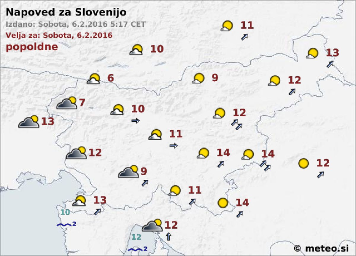 Danes bo pretežno jasno, le v zahodnih in ponekod v osrednjih krajih bo zmerno, na zahodu občasno tudi pretežno oblačno. Čez dan bo v večjem delu države zapihal jugozahodni veter. Najvišje dnevne temperature bodo od 6 do 11, na Primorskem in v vzhodnih krajih do 14 stopinj C.