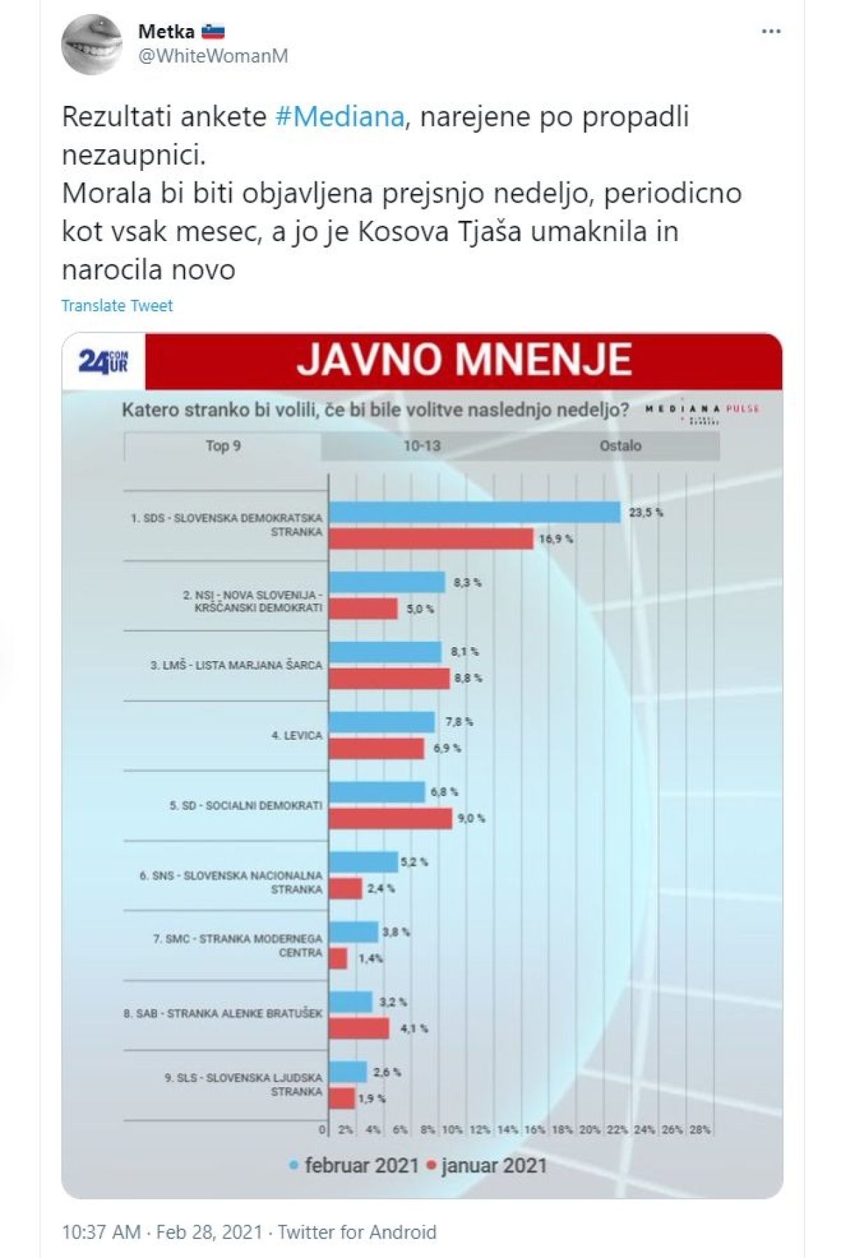 Na POP TV so sicer popoldne opozorili, da je v nedeljo ena izmed uporabnic na družbenem omrežju objavila fotografijo (domnevne) javnomnenjske raziskave Mediane za 24ur.com, ki prikazuje višjo podporo vladnim strankam in nižjo opozicijskim. Pri tem je uporabnica navedla, da bi morali biti rezultati te ankete objavljeni prejšnjo nedeljo, "periodično kot vsak mesec", a da so jo na POP TV umaknili in naročili novo.