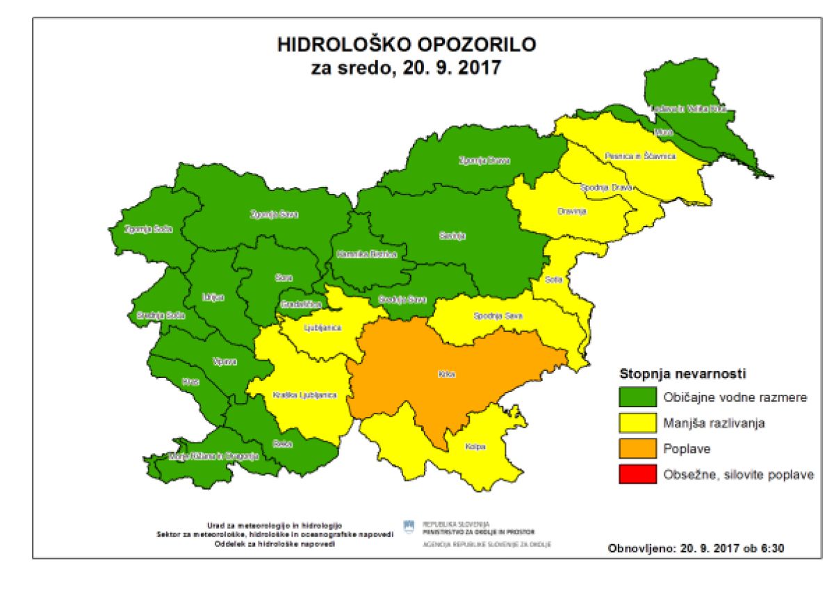 Agencija za okolje (Arso) je izdala opozorilo, da bodo nekatere reke, posebej Krka, danes tudi poplavljale.