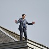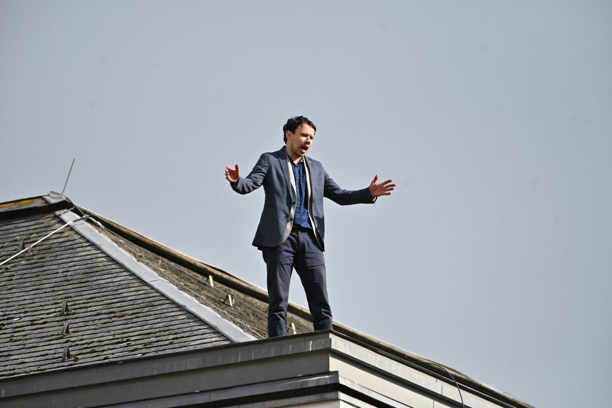 Poslanec SDS Hoivik kričal s strehe parlamenta in grozil, da bo skočil – po posredovanju gasilcev varno sestopil (FOTO)