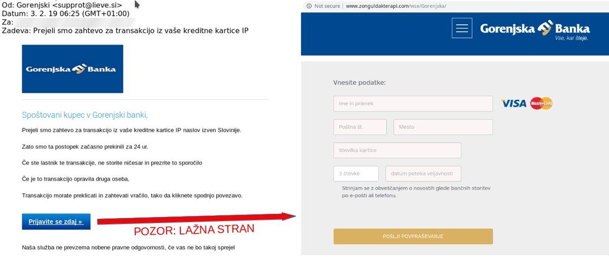 "Ste prejeli sporočilo v imenu Gorenjske banke? Pozor: ne klikajte, gre za phishing, ukradli vam bodo podatke o kreditni kartici. Če ste podatke slučajno vpisali, pa se nemudoma obrnite na banko," so včeraj prek spletnega družbenega omrežja Twitter sporočili iz centra SI-CERT.