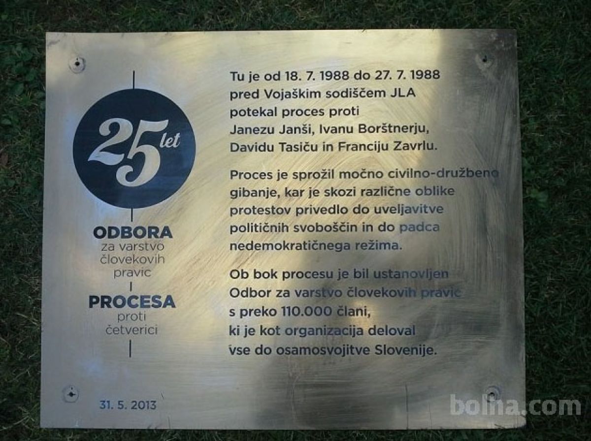 Ploščo, na kateri je v nekaj stavkih opisan proces proti četverici in delovanje Odbora za varstvo človekovih pravic, so 31. maja odkrili vpleteni v afero Janez Janša, David Tasič in Franci Zavrl, manjkaj pa je četrti vpleteni Ivan Borštner. Dogodek je spremljalo več sto ljudi, nekateri so prinesli cvetje, nekateri pa tudi transparente v podporo Janši.
