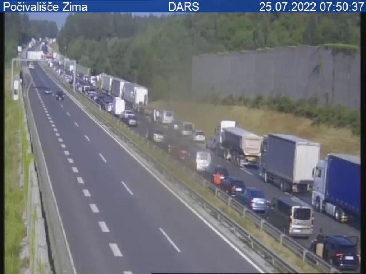 Zastoj tovornih vozil na gorenjski avtocesti pred predorom Karavanke proti Avstriji je dol kilometer in pol. Predor Karavanke občasno zapirajo proti Sloveniji, zaradi zastoja, ki je dolg 2 kilometra.