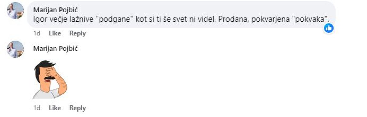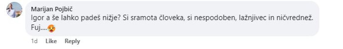 »Igor večje lažnive 'podgane' kot si ti še svet ni videl. Prodana, pokvarjena 'pokvaka',« je nekdanji poslanec SDS Marijan Pojbič zapisal pod objavo naslovnice aktualne revije Reporter na mojem facebook profilu.