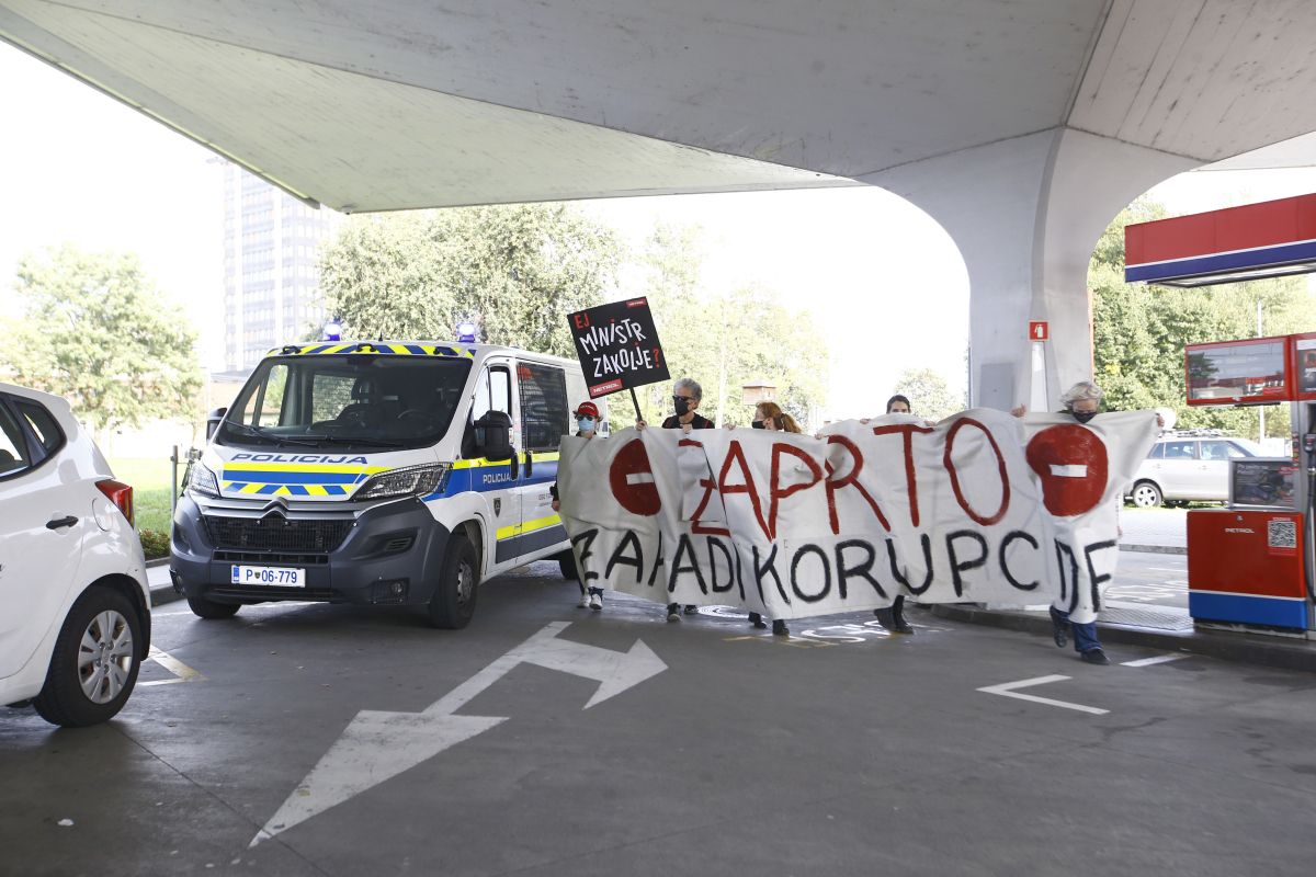 Manjša skupina, vse skupaj je bilo na prizorišču okoli deset protestnikov, je za krajši čas preprečila uvoz vozilom na bencinski servis. V rokah so držali transparent: "Zaprto zaradi korupcije." Po nekaj minutah je prišla policija in protestniki so se umaknili.