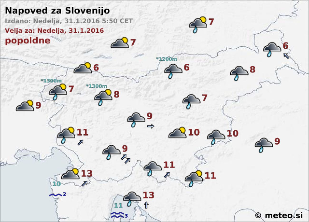 Danes bo pretežno oblačno, ponekod bo občasno rahlo deževalo. Proti večeru se bo oblačnost od zahoda začela trgati. Jugozahodni veter bo dopoldne oslabel, pihal bo večinoma le še v višjih legah na Notranjskem in Kočevskem. Najvišje dnevne temperature bodo od 6 do okoli 12 stopinj C.