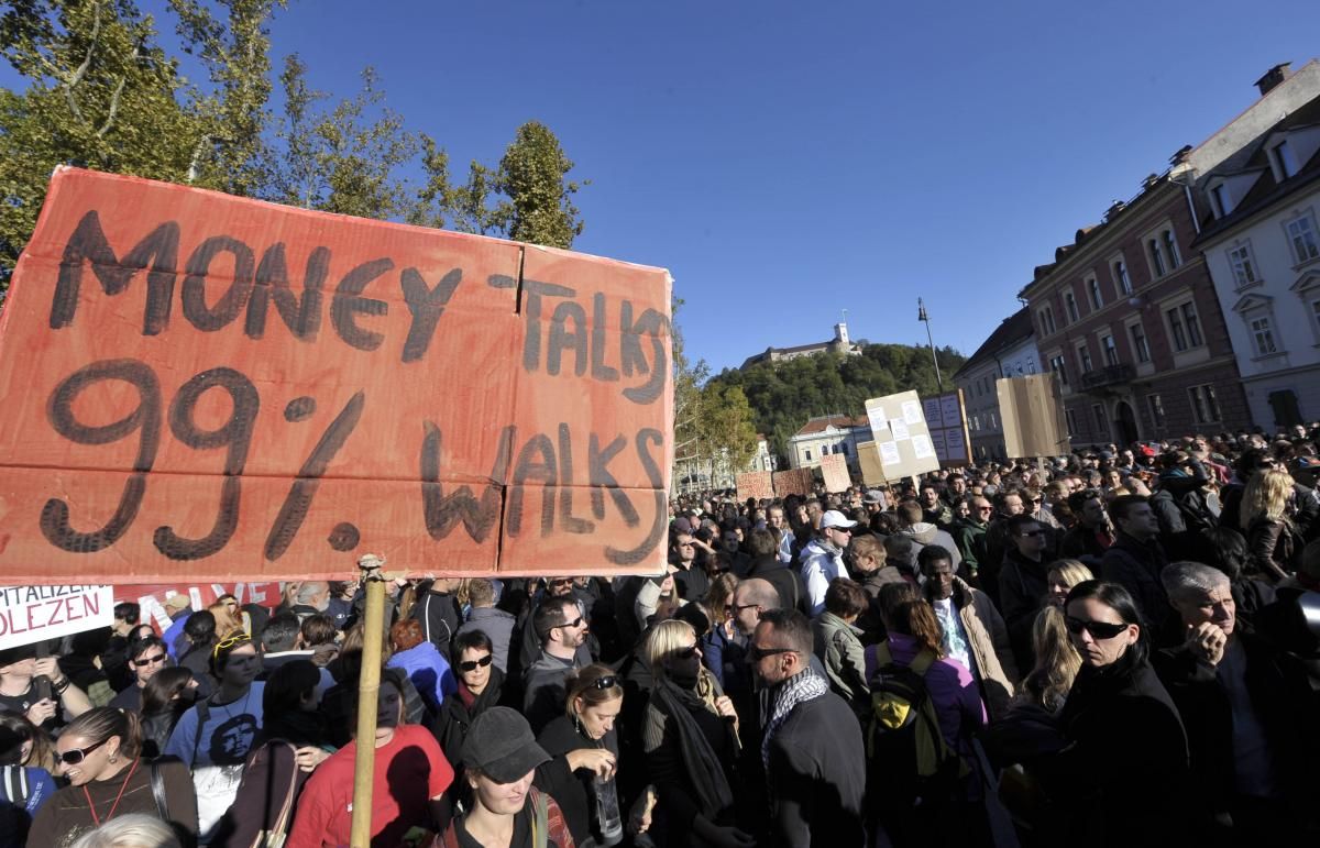 V okviru globalnih protestov se je na Kongresnem trgu v Ljubljani zbralo približno 300 protestnikov, ki nasprotujejo "nasilju finančnega kapitalizma", njihovo število pa še narašča. Del protestnikov naj bi se zdaj po napovedih odpravil pred stavbo ameriškega veleposlaništva, nekateri pa naj bi se odpravili pred Ljubljansko borzo.