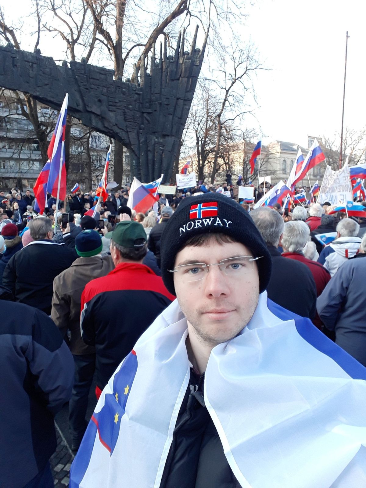 Na sredinem shodu iniciative za upokojencev se je med mnogimi člani SDS pojavil tudi 31-letni Klemen Traven s kapo z napisom Norway (Norveška).
