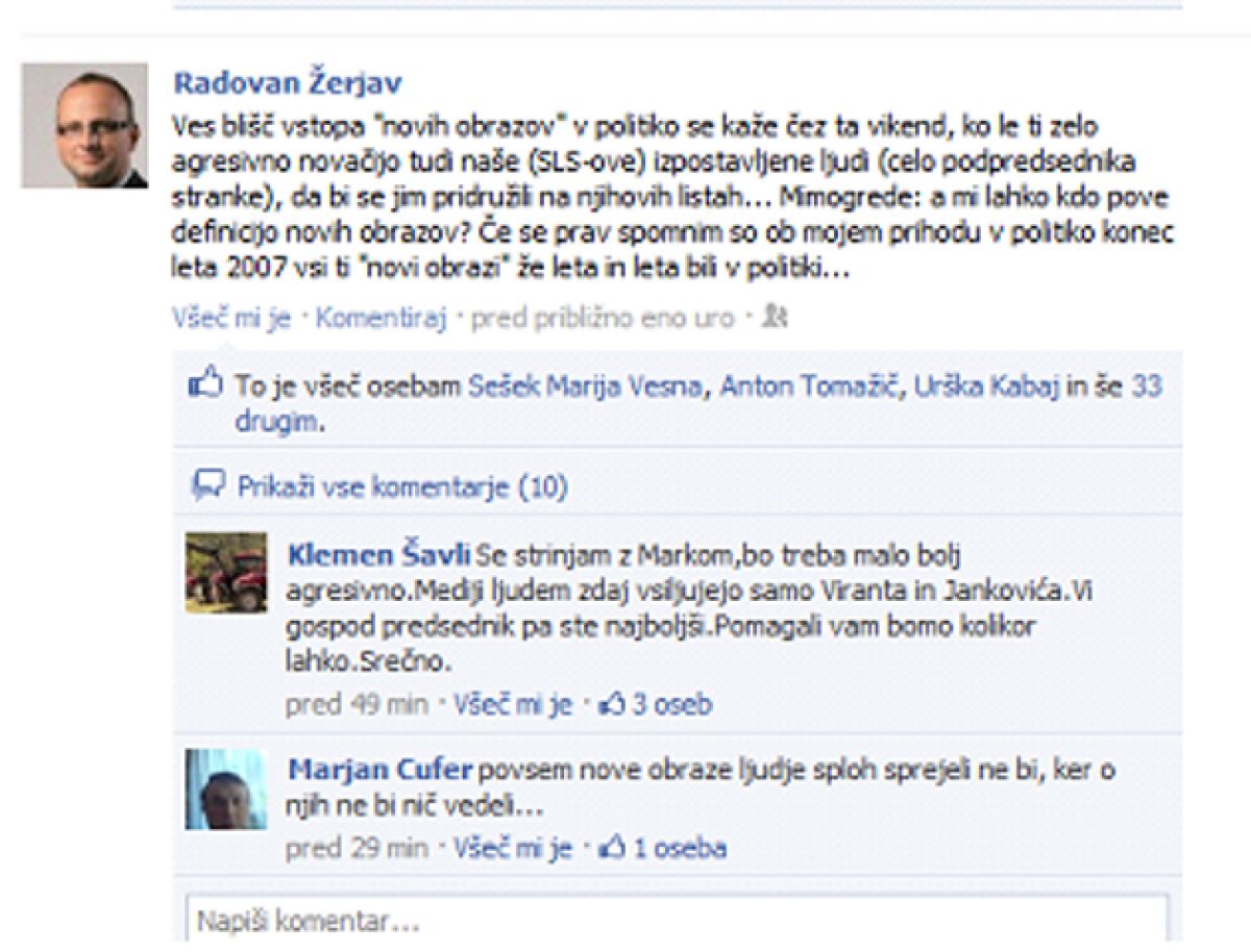 »Ves blišč vstopa "novih obrazov" v politiko se kaže čez ta vikend, ko le ti zelo agresivno novačijo tudi naše (SLS-ove) izpostavljene ljudi (celo podpredsednika stranke), da bi se jim pridružili na njihovih listah... Mimogrede: a mi lahko kdo pove definicijo novih obrazov? Če se prav spomnim so ob mojem prihodu v politiko konec leta 2007 vsi ti "novi obrazi" že leta in leta bili v politiki...«