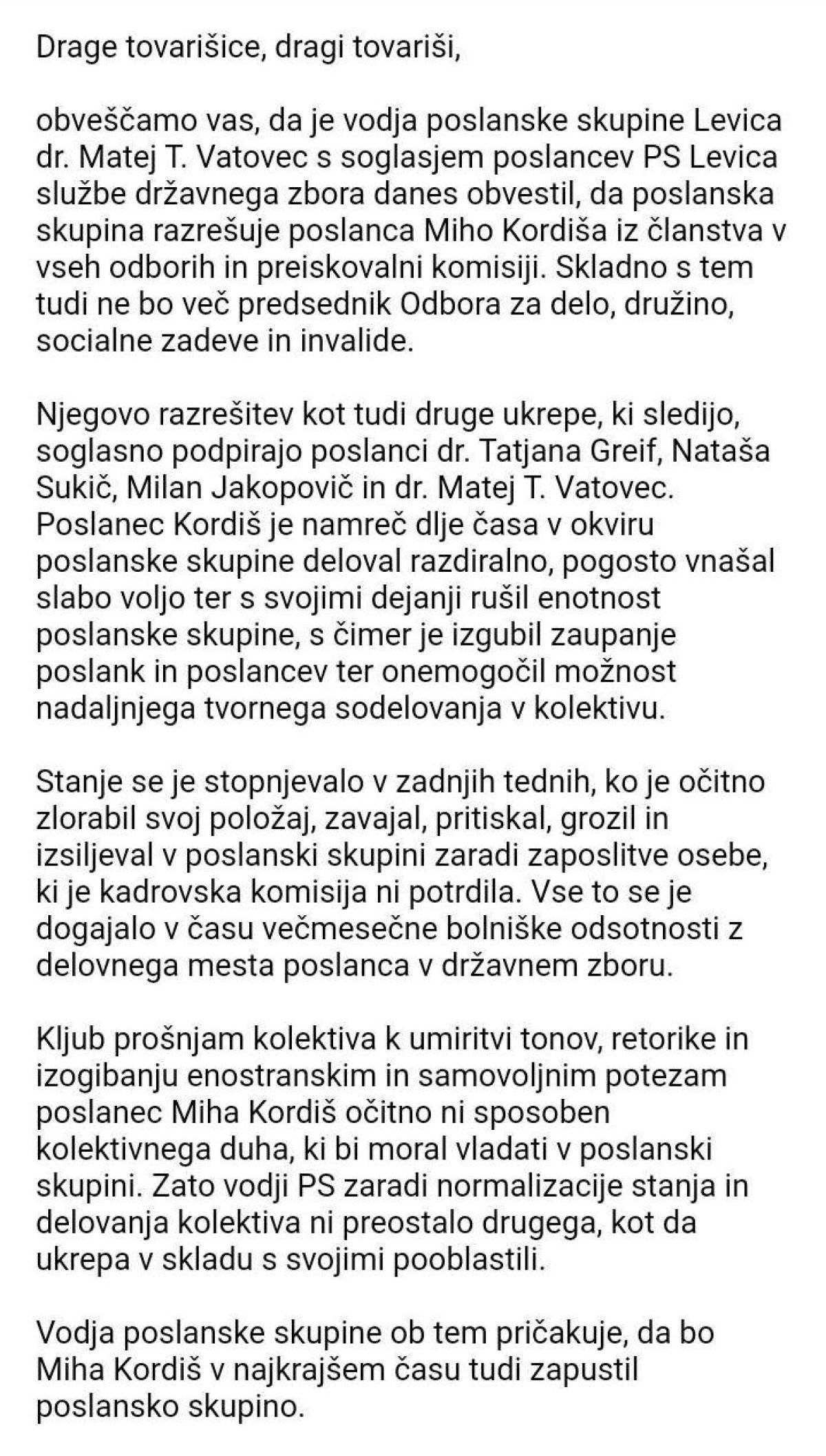 Poslanska skupina Levica je na mandatno volilno komisijo DZ poslala predlog za razrešitev poslanca Mihe Kordiša z mesta predsednika odbora za delo, družino, socialne zadeve ter z mesta člana v odborih DZ in v preiskovalni komisiji zaradi "zlorabe položaja, zavajanj, pritiskov, groženj in izsiljevanja v poslanski skupini", so sporočili iz Levice.