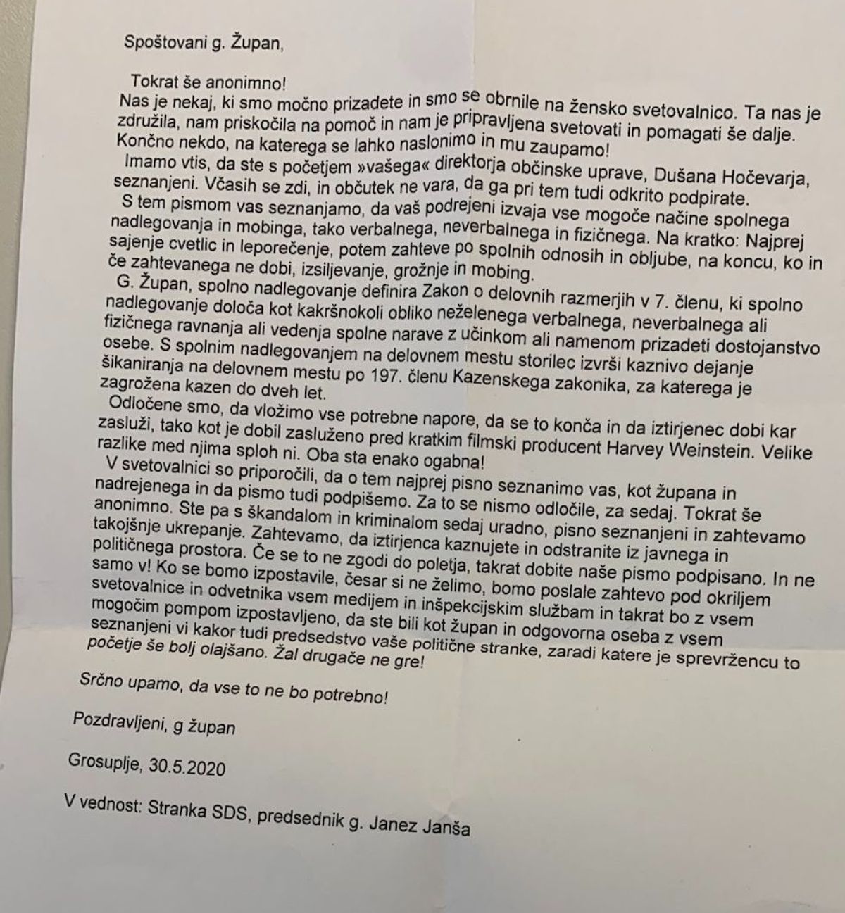 Anonimka z očitki spolnega nadlegovanja na občini Grosuplje.