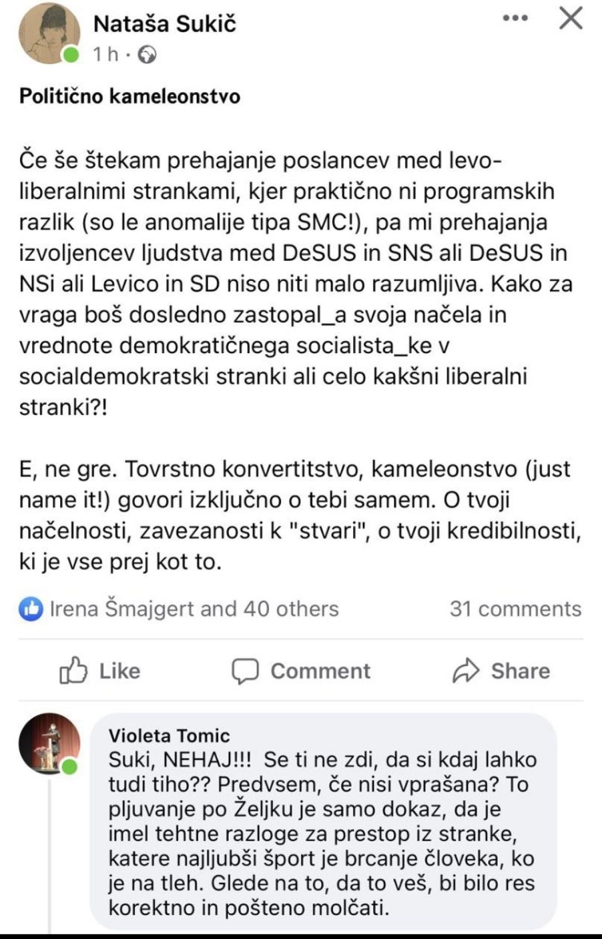 Vmes se je danes na facebooku zapletla še v prepir s poslanko Levice Natašo Sukič, ki se je obregnila ob prestope poslancev, kot je bil nedavni Željka Ciglerja iz Levice v SD, pri čemer je bila Sukičeva kritična do »kameleonstva« takih poslancev.