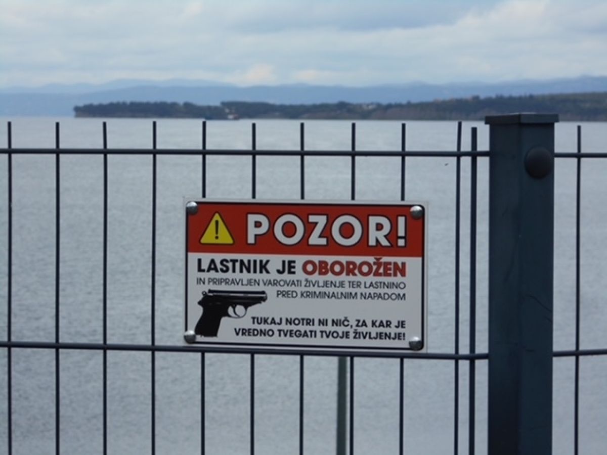 »Pozor! Lastnik je oborožen,« opozarjajo table na ograji morebitne pridaniče, ki bi nameravali iz tega ali onega razloga vstopiti na Jelinčičevo posest.