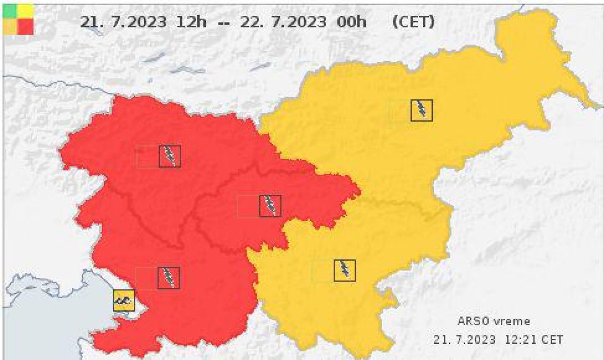 Agencija RS za okolje (Arso) je za zahodni in osrednji del Slovenije razglasila rdeče opozorilo. Na zahodu opozorilo velja med 13. in 17. uro, v osrednjem delu Slovenije pa med 13. in 18. uro. V tem času so verjetna številna močna neurja s točo, močnejšim pišem vetra in udari strel, opozarja Arso.