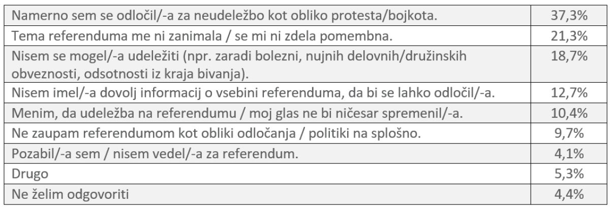 »Namerno sem se odločil/-a za neudeležbo kot obliko protesta/bojkota,« je najpogosteje naveden razlog med tistimi, ki se referenduma niso udeležili. Tak odgovor je navedlo 37% neudeležencev. Dobra petina (21%) je izbrala odgovor »tema referenduma me ni zanimala / se mi ni zdela pomembna,« slaba petina (19%) pa odgovor »nisem se mogel/-a udeležiti (npr. zaradi bolezni, nujnih delovnih/družinskih obveznosti, odsotnosti iz kraja bivanja)«. Rezultati so prikazani v tabeli. Možnih je bilo več odgovorov, zato je seštevek vseh odgovorov višji od 100. Večinoma so se sicer neudeleženci odločili za en odgovor, le priblžno vsak četrti je v povprečju izbral dva.