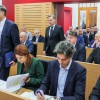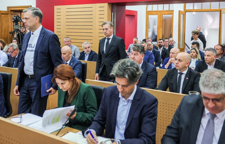Robert Golob z ministrsko ekipo na prvi izredni seji občinskega sveta Novo mesto. Poleg Andreje Katič, Luke Mesca in Boštjana Poklukarja je prišel tudi šolski minister Vinko Logaj.