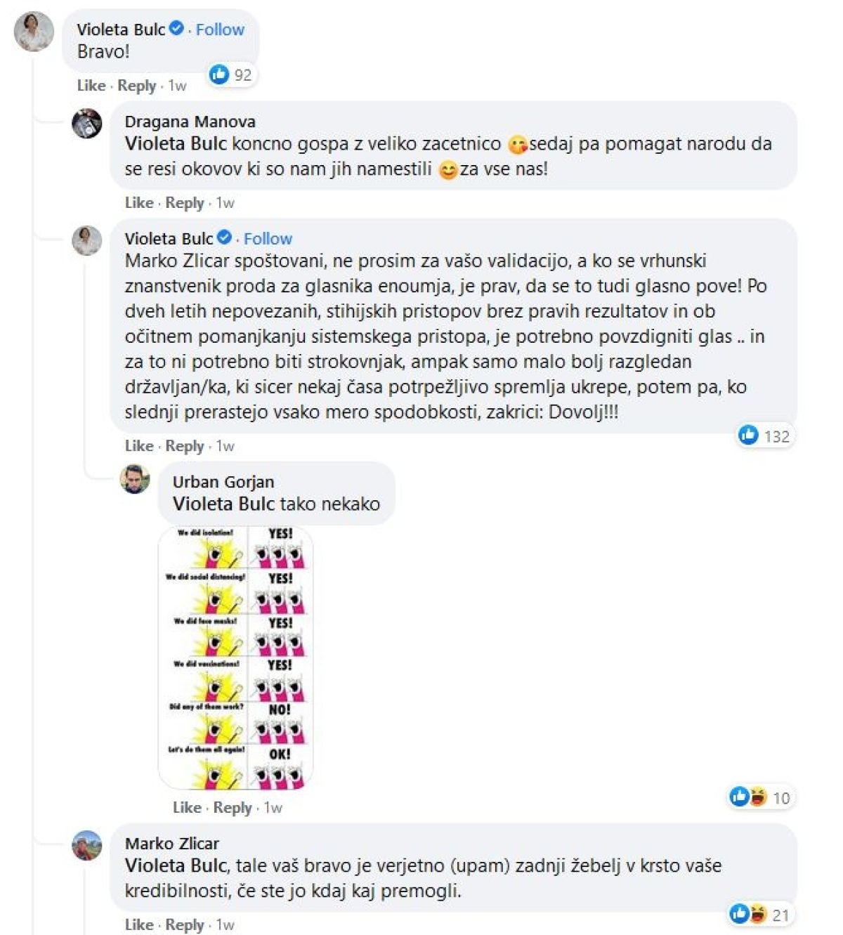 »Bravo!« je napisala Bulčeva v komentarju pod Valičevo objavo in se tako zelo očitno postavila na stran anticepilcev. Slednji so bili nad njo navdušeni, manj pa zdravstveni strokovnjaki. Anesteziolog Marko Žličar iz UKC Ljubljana ji je odpisal: »Violeta Bulc, tale vaš bravo je verjetno (upam) zadnji žebelj v krsto vaše kredibilnosti, če ste jo kdaj kaj premogli.«