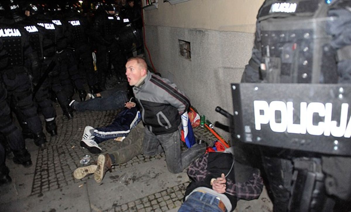 Posamezni protestniki so v policiste pričeli metati bakle, pirotehnične izdelke, granitne kocke, kamenje, palice in druge predmete. Policisti so zato protestnikom ukazali, naj prenehajo s kršitvami in jih opozorili, da bodo uporabili prisilna sredstva v primeru nadaljevanja kršitev. Ker množica ni upoštevala zakonitega ukaza in je nadaljevala s hujšo in množično kršitvijo javnega reda, so policisti shod razpustili.