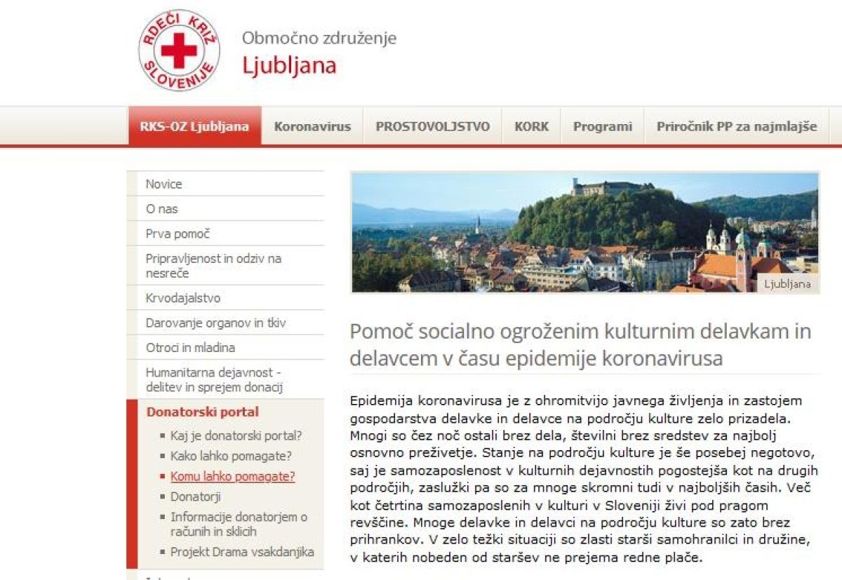 Obenem so iz Skupine za pomoč samozaposlenim v kulturi sporočili, da je s podporo Rdečega križa stekla akcija zbiranja sredstev za socialno ogrožene kulturne delavke in delavce. Zbrana donatorska sredstva bodo namenjena plačilu položnic za osnovne življenjske stroške. Za pomoč pa lahko zaprosijo samozaposleni v kulturi in tudi tisti, ki nimajo nobenega statusa, a lahko s portfeljem izkažejo svojo dejavnost na področju kulture.