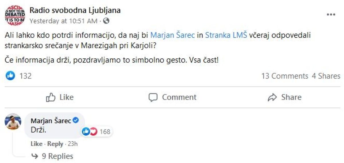 Facebook profil Radio svobodna Ljubljana je na Šarca in stranko naslovil vprašanje, ali drži informacija, da je LMŠ odpovedala obisk Karjole, in Šarec je odgovoril, da to »Drži.«