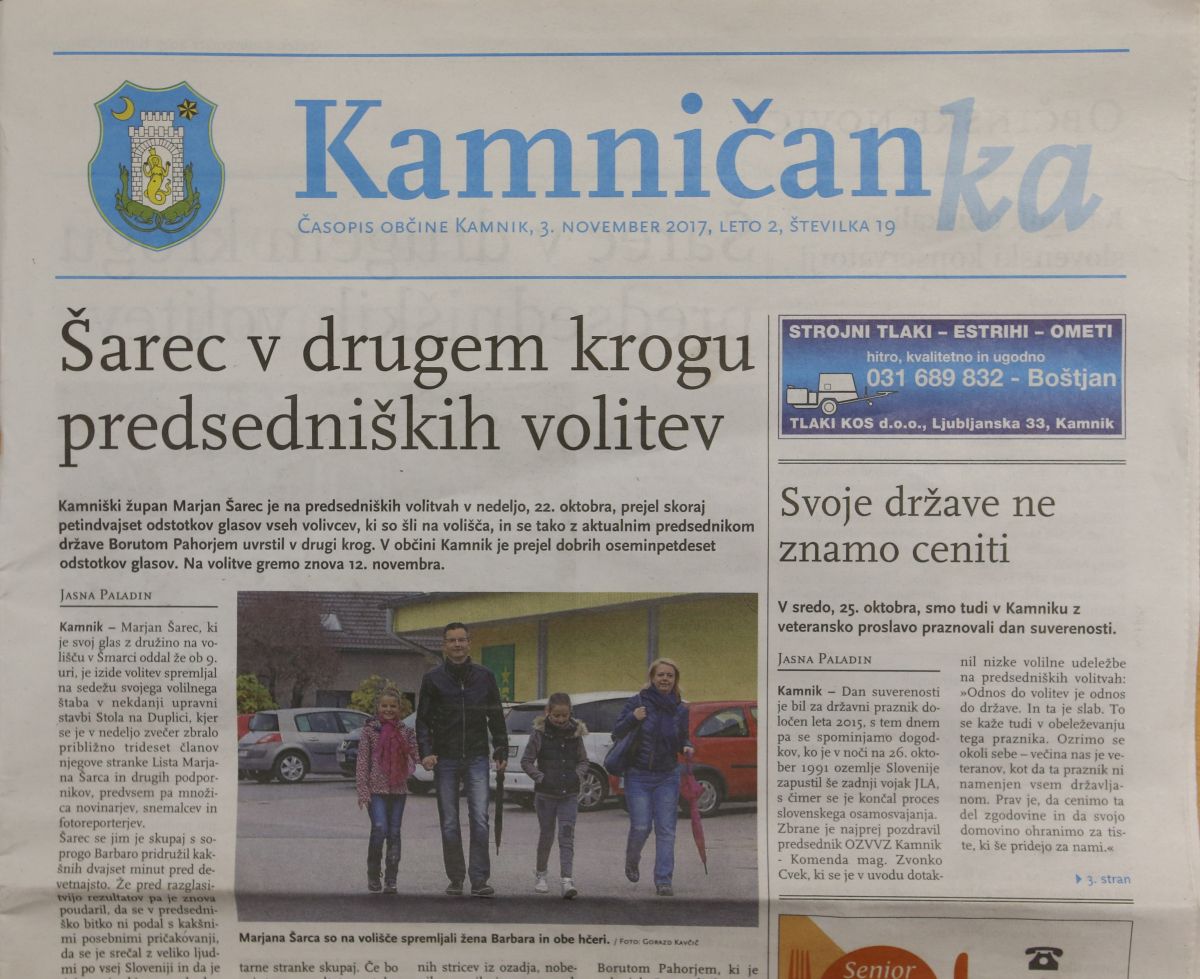 Prvi dve strani časopisa Kamničan-ka obsegata članek z naslovom Šarec v drugem krogu predsedniški volitev.
