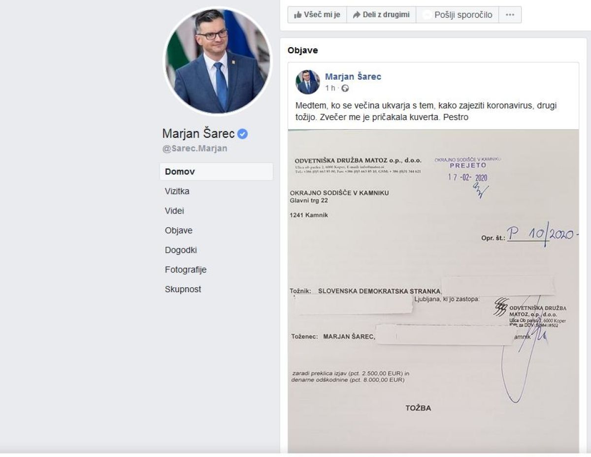 Danes pa je Šarec na Facebooku objavil fotografijo prve strani tožbe, vložene na Okrajno sodišče v Kamniku, iz katere je razvidno, da SDS od njega zahteva preklic izjav in denarno odškodnino. "Medtem ko se večina ukvarja s tem, kako zajeziti koronavirus, drugi tožijo. Zvečer me je pričakala kuverta. Pestro," je ob tem zapisal odhajajoči premier.