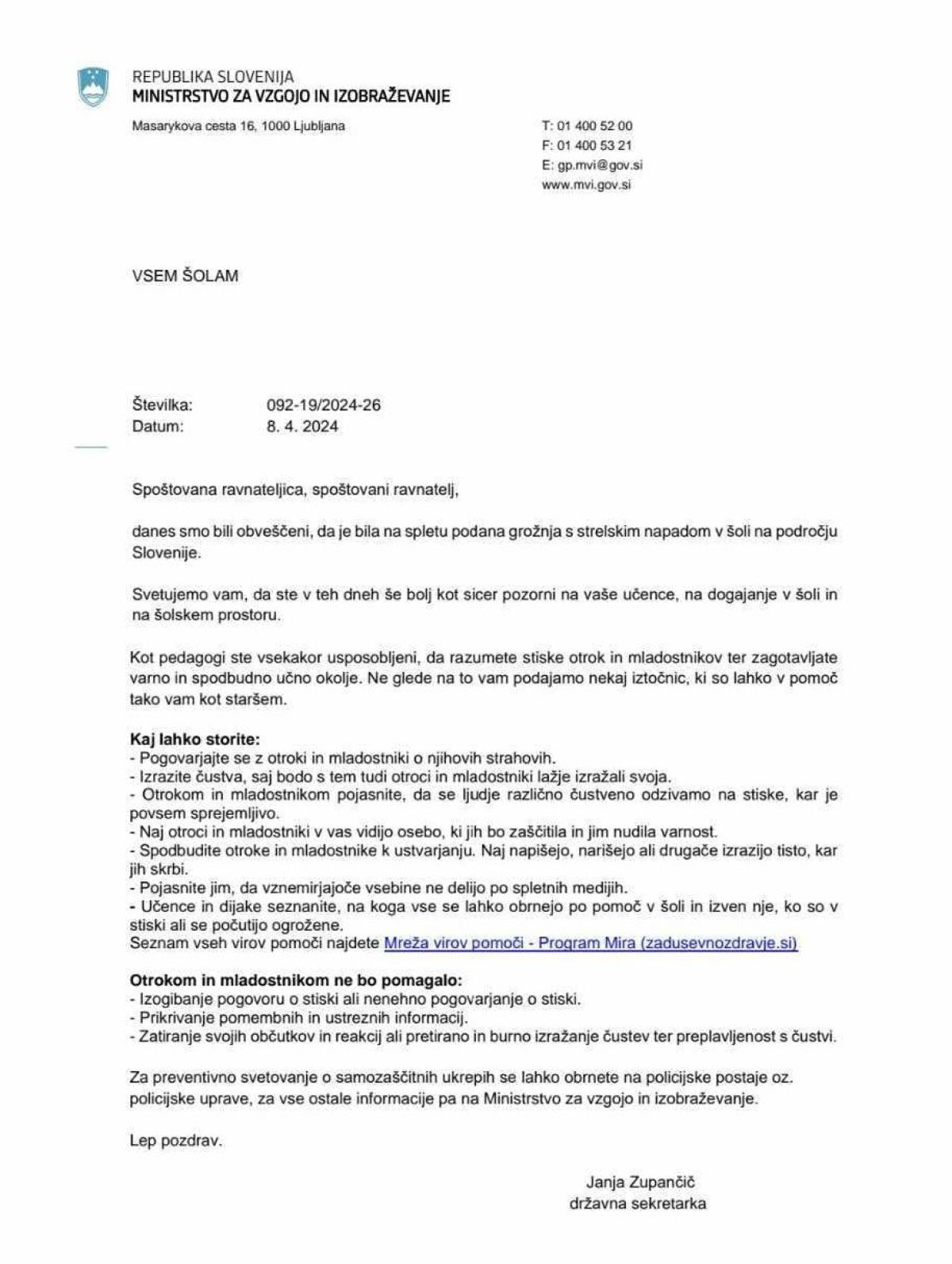 »Svetujemo vam, da ste v teh dneh še bolj kot sicer pozorni na vaše učence, na dogajanje v šoli in na šolskem prostoru,« piše v okrožnici, ki jo je državna sekretarka na ministrstvu za vzgojo in izobraževanje Jana Zupančič včeraj poslala ravnateljem in ravnateljicam slovenskih šol.