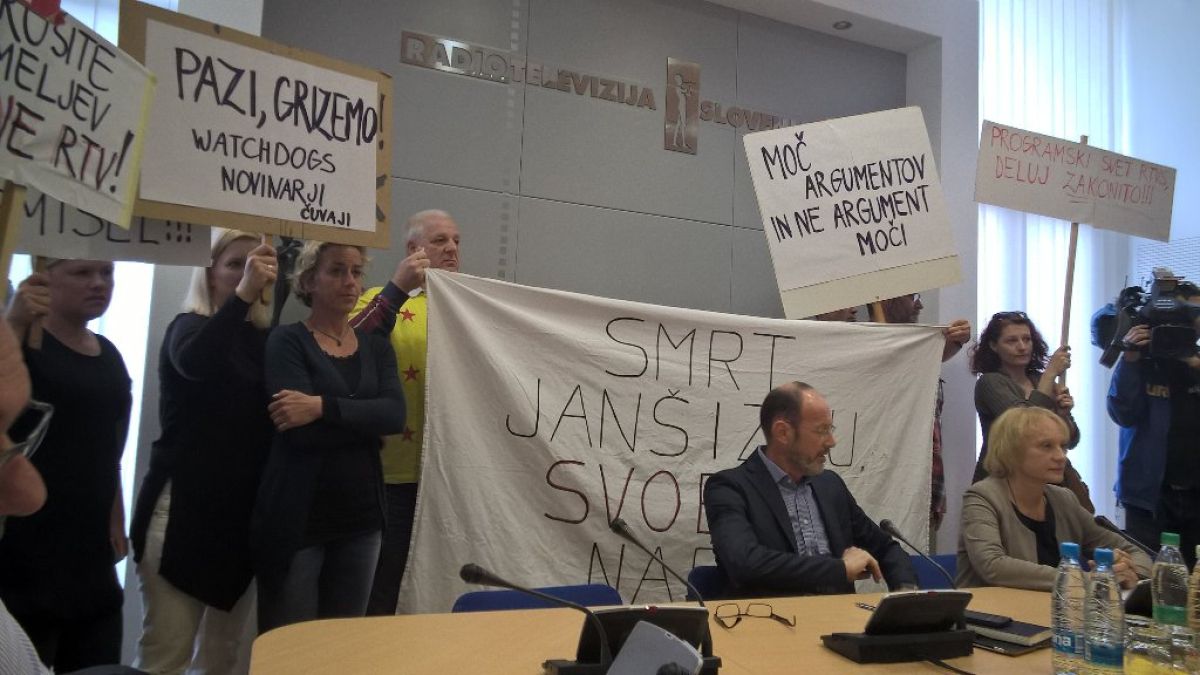 »Smrt janšizmu, svoboda narodu,« se je glasil eden od transparentov, ki so jih ob začetku seje programskega sveta RTV Slovenije nosili novinarji in uredniki (ob pomoči nekaterih »gostov«) nacionalne javne medijske hiše.