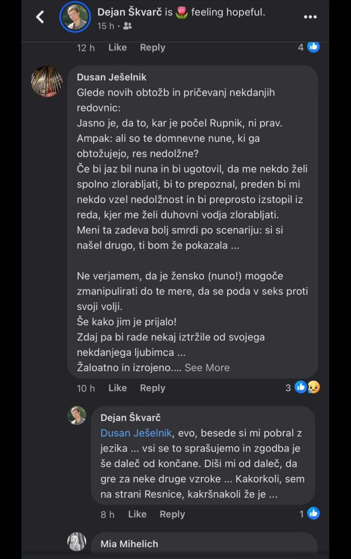 »Ne verjamem, da je žensko (nuno!) mogoče zmanipulirati do te mere, da se poda v seks proti svoji volji. Še kako jim je prijalo! Zdaj pa bi rade nekaj iztržile od svojega nekdanjega ljubimca,« je namreč zapisal Dušan Ješelnik, sicer učitelj orgel na Glasbeni šoli Nova Gorica. »Evo, besede si mi pobral z jezika,« se je odzval Škvarč, ki med komentatorji sicer ni imel veliko somišljenikov. Verjetno je zato po več negativnih odzivih zbrisal fotografijo svojega poziranja z Rupnikom.