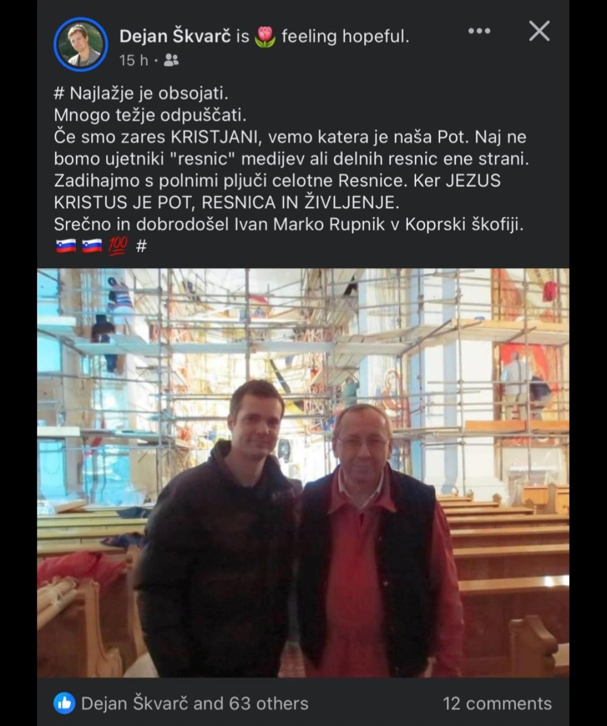 »Če smo zares KRISTJANI, vemo, kakšna je naša Pot. Naj ne bom ujetniki 'resnic' medijev ali delnih resnic ene strani. Zadihajmo s polnimi pljuči celotne Resnice. Ker JEZUS KRISTUS JE POT, RESNICA IN ŽIVLJENJE. Srečno in dobrodošel Ivan Marko Rupnik v Koprski škofiji,« je Škvarč še zapisal ob fotografiji.
