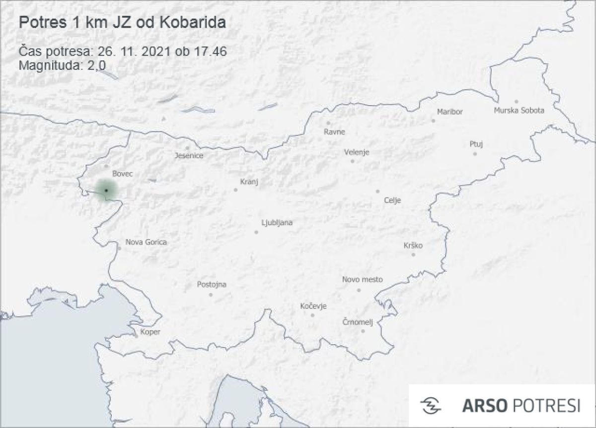 Seizmografi državne mreže potresnih opazovalnic so danes ob 17.46 zabeležili šibek potresni sunek, magnitude 2,0. Po prvih podatkih je bilo žarišče potresa 77 kilometrov zahodno od Ljubljane, v bližini Kobarida.