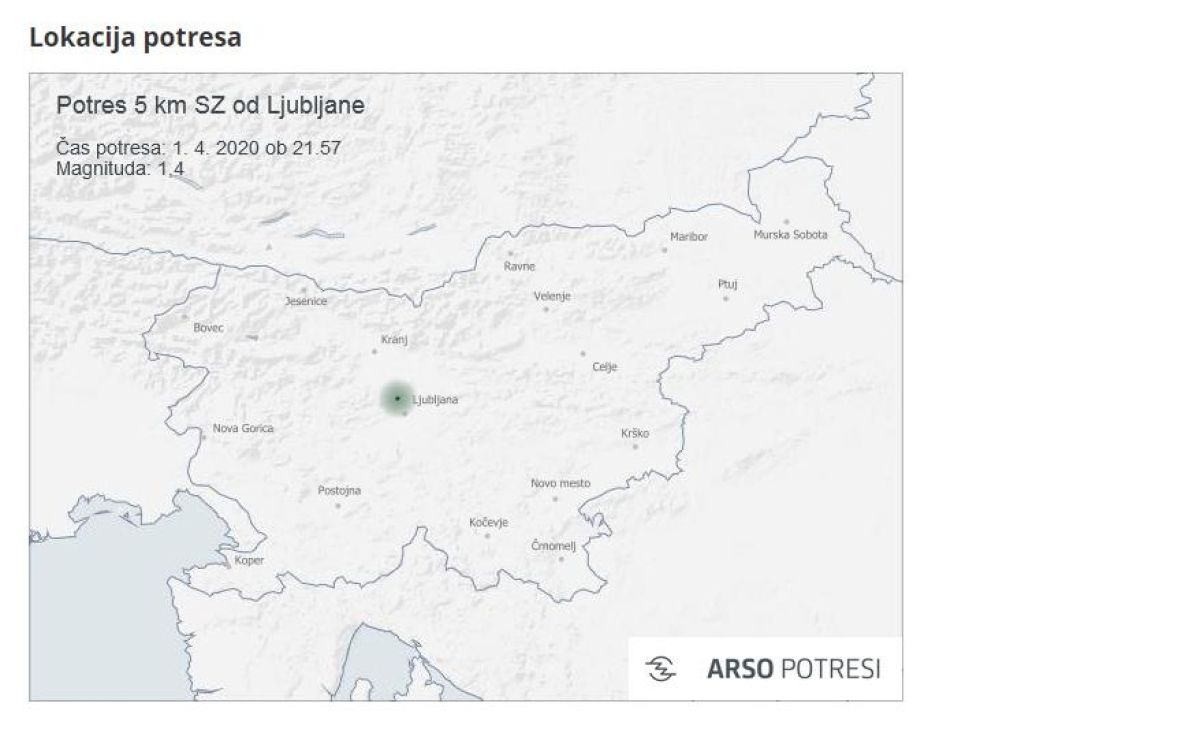 Seizmografi državne mreže potresnih opazovalnic so v sredo ob 21.57 zabeležili šibek potresni sunek, magnitude 1,4. Po prvih podatkih je bilo žarišče potresa 6 kilometrov severozahodno od Ljubljane, v bližini Ljubljane.