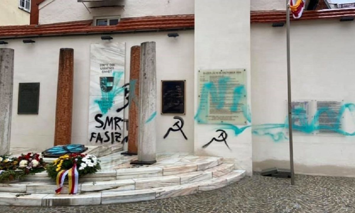 Skrajneži so v Celovcu oskrunili spomenik koroški enotnosti: pomazali so ga z barvo in napisom "Smrt fašizmu"