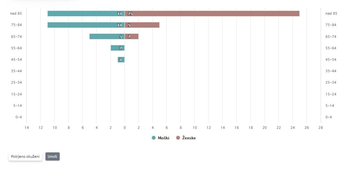 Med potrjeno okuženimi je bilo v nedeljo največ starih med 45 in 54 let. Največ potrjeno okuženih žensk je prav v tej starostni skupini, moških pa je največ v starostni skupini od 55 do 64 let.