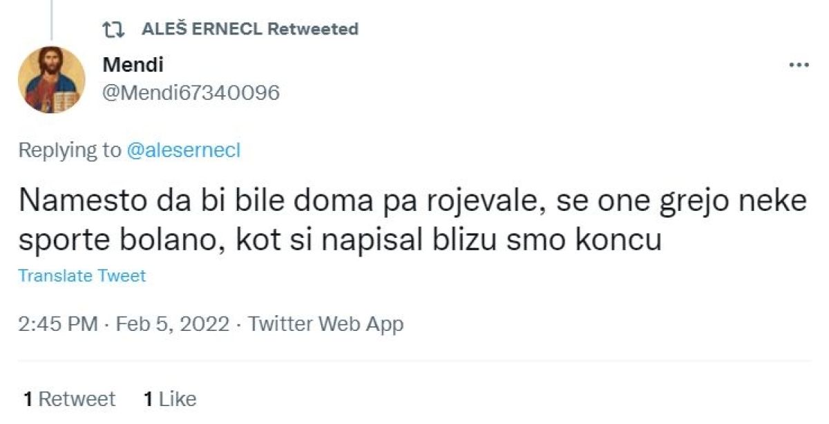 »Si predstavljate, da je vojna, mi, moški, pa ženske čakamo na kolodvoru, da se vrnejo? No, tako se jaz počutim glede vsake nacije, ki resno jemlje ženski šport, se iskreno veseli zmagam svojih športnic ali jih celo forsira kot nacionalne ambasadorke,« je tvitnil Ernecl. Ob tem sta tako on ko Koman pridno retvitala podobno ekstremistična stališča peščice somišljenikov ter se prepirala s kritiki.
