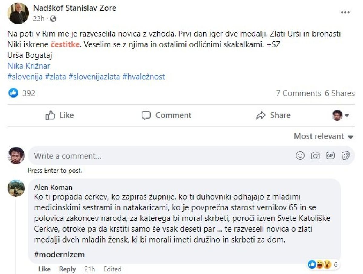 Za katoliškega ekstremista Alena Komana je veselje ob dosežku Urške in Nike zgrešeno – po njegovem bi morali biti dekleti gospodinji, ki skrbita za dom in družino, ne pa da tratita čas s športom. Tako je vsaj mogoče sklepati iz njegovega komentarja pod čestitko, ki jo je nadškof Stanislav Zore na facebooku namenil skakalkama.