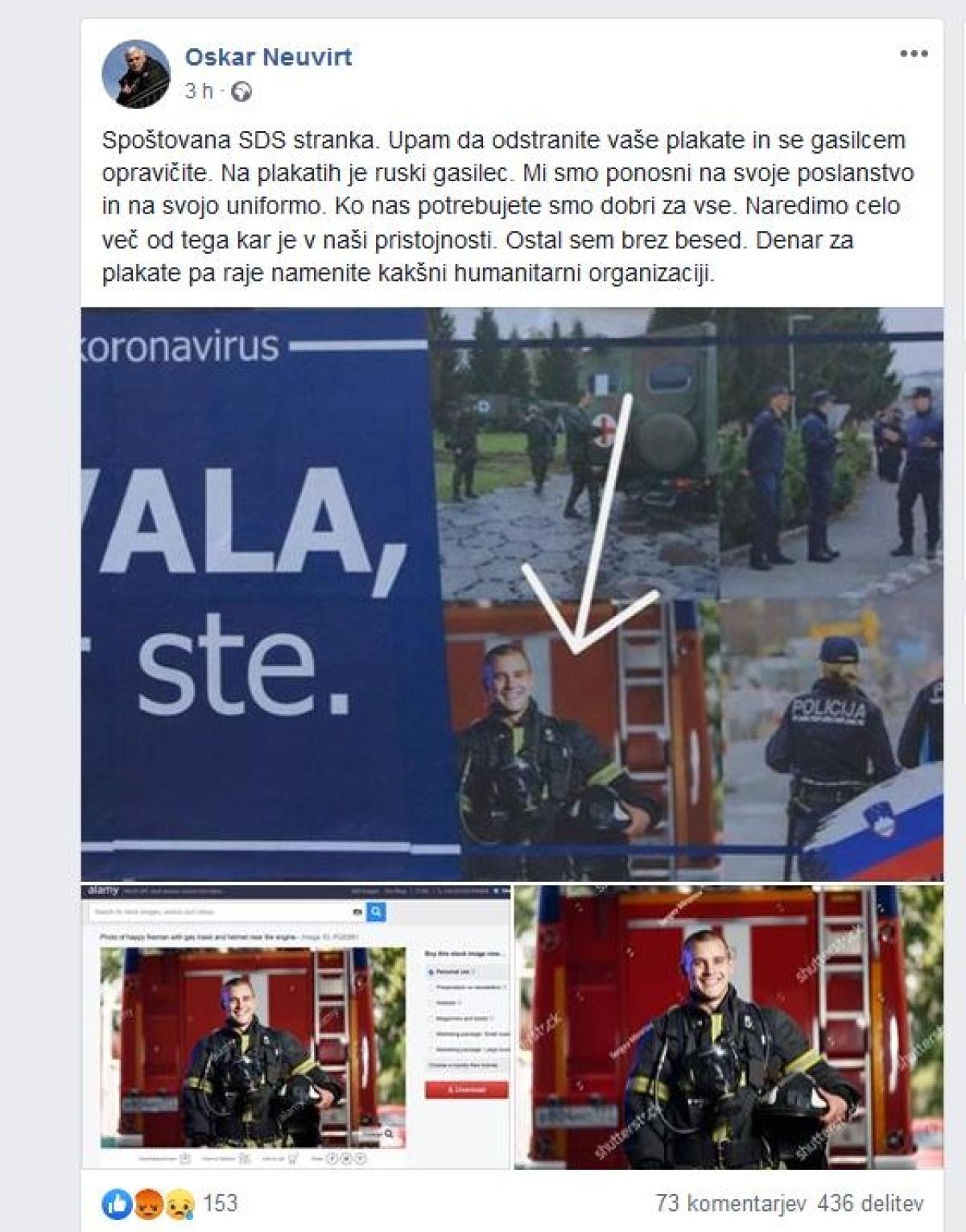 Stranka SDS je med velikonočnimi prazniki presenetila s plakatno kampanjo, v okviru katere se zahvaljujejo vsem, ki ostajajo doma, ter tistim, ki se po službeni dolžnosti borijo proti virusu, med drugim tudi vojski, policiji, civilni zaščiti in gasilcem. A prav slednji so ob tem zgroženi, saj se je na plakatu znašla kupljena slika ruskega gasilca.