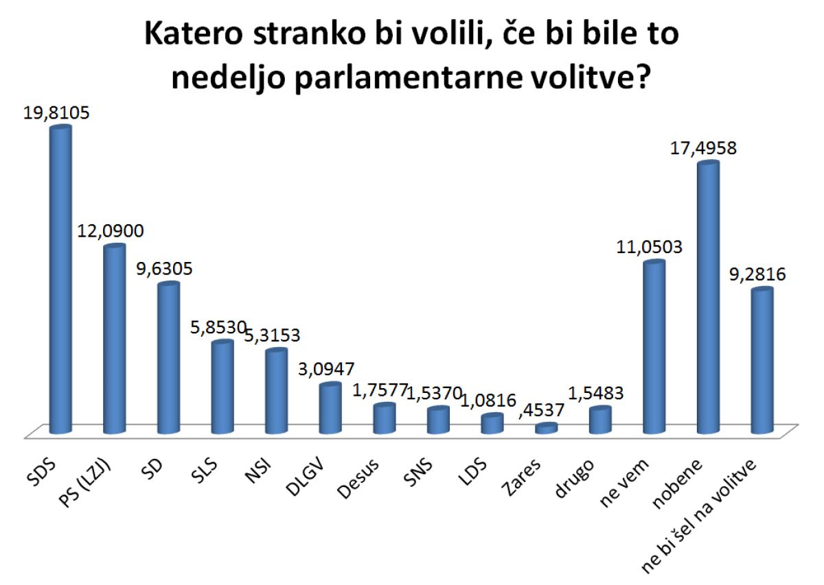 Če bi bile parlamentarne volitve v nedeljo, bi največ glasov dobila stranka SDS, in sicer 19,8 odstotka, kažejo rezultati raziskave Slovenski utrip. Sledijo stranka Pozitivna Slovenija z nekaj več kot 12 odstotki, SD z 9,6 odstotka, SLS s 5,8 odstotka ter NSi s 5,3 odstotka.