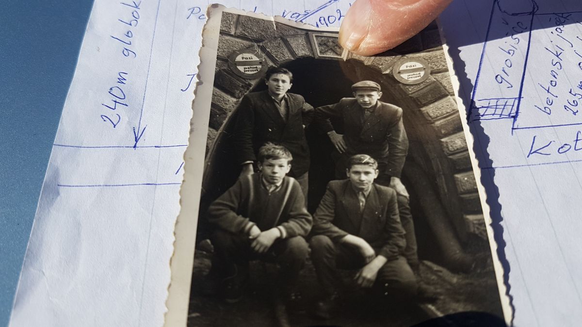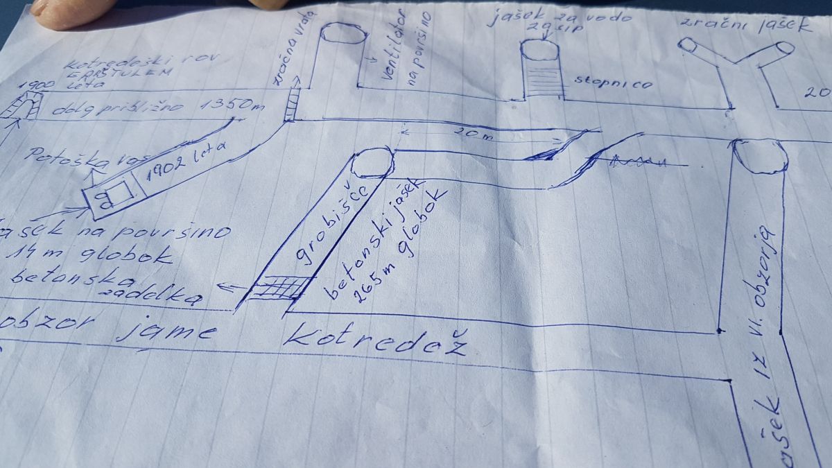 Ker do njegovega ogleda še ni prišlo, smo se v teh dneh znova oglasili pri upokojenem rudarju, ki nam je pokazal svoj načrt, kje v zasutem jašku naj bi se nahajale žrtve povojnih pobojev (slika 1). „V jami Kotredež sem začel delati kot vajenec 9.9.1960 v popoldanski izmeni. V spomin mi je ostala fotografija posneta pred vhodom v jamo (slika 2). Spomnim se, ko smo šli po rovu in prišli do bližine jaška, kjer naj bi bile žrtev povojnih pobojev, da nas je mojster oziroma „štajger“ opozoril, da se nimamo kaj zadrževati blizu tega jaška niti se v ta jašek ne smemo spustiti. Kar se niti ni dalo,“ nam pove in doda, da se takrat nihče ni spraševal, zakaj to opozorilo.