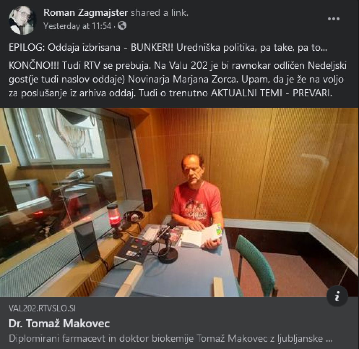 Na Valu 202 so pred dnevi predvajali pogovor s Tomažem Makovcem, ki je v eter nacionalnega radi širil teorije zarote o cepljenju. Po burnem odzivu javnosti in kritkah strokovnjakov je Val 202 posnetek oddaje umaknil s spletne strani in se opravičuje.