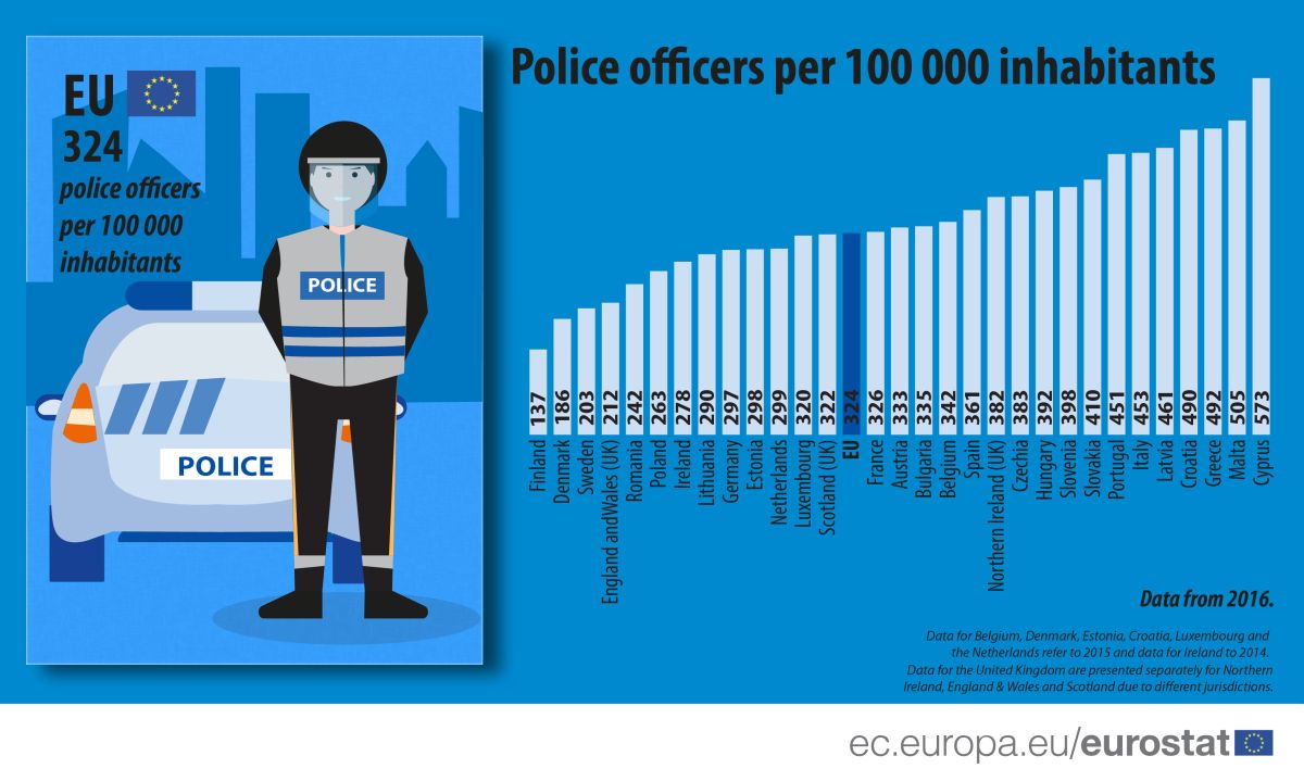 V celotni EU je povprečno 324 policistov na 100.000 prebivalcev, so pa med državami velike razlike. Najmanj policistov na 100.000 ljudi imajo na Finskem (137), največ pa na Cipru (573), ugotavlja Eurostat.