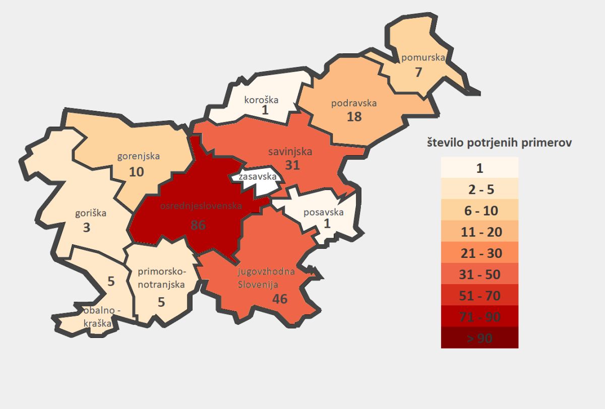Po epidemioloških podatkih do danes do 10. ure, obolele osebe prihajajo iz naslednjih statističnih regij: 86 iz osrednjeslovenske, 46 iz jugovzhodne Slovenije, 31 iz savinjske, 18 iz podravske, 10 iz gorenjske, 7 iz pomurske, 5 iz obalno-kraške, 5 iz primorsko-notranjske, 3 iz goriške 1 iz koroške, 1 iz posavske regije. 2 obolela sta tuja državljana, za 1 osebo podatek o statistični regiji bivanja ni znan.