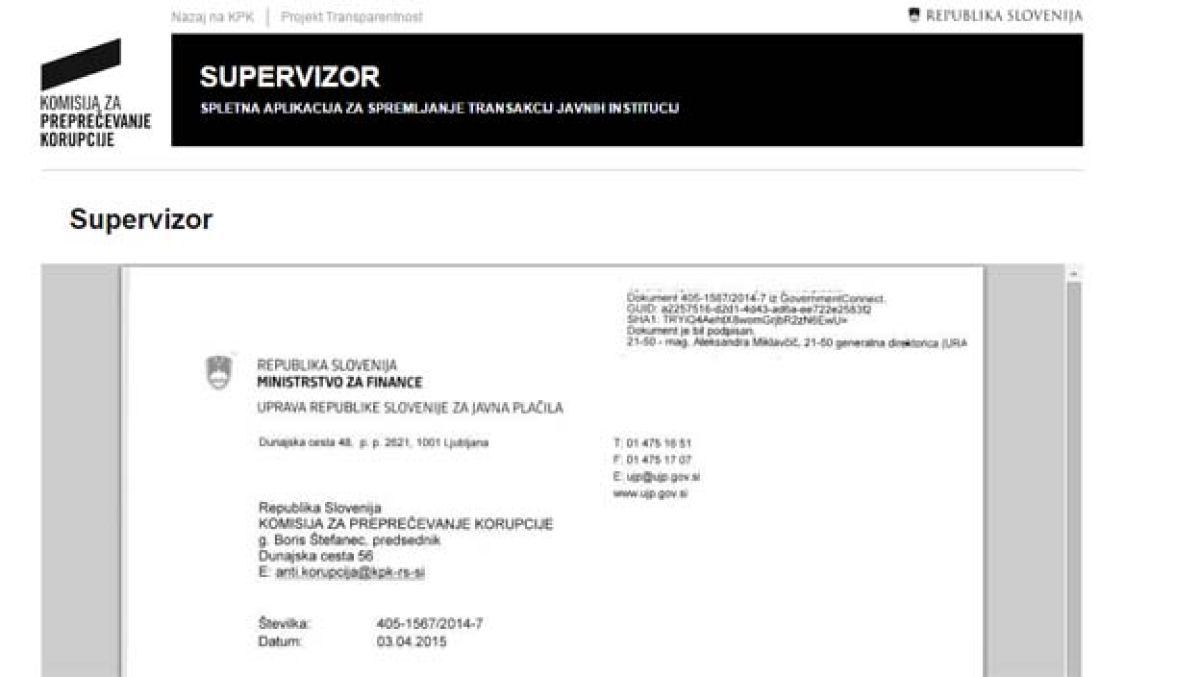 KPK je namreč danes ustavila delovanje Supervizorja, saj ji je Uprava RS za javna plačila sporočila, da z današnjim dnem začasno prekinja izvajanje sporazuma o izmenjavi podatkov o plačilnih transakcijah. Tako so se na upravi, kot so pojasnili v dopisu KPK, odločili zaradi postopka, ki poteka pri informacijskem pooblaščencu zaradi objave podatkov o prejemnikih avtorskih honorarjev.