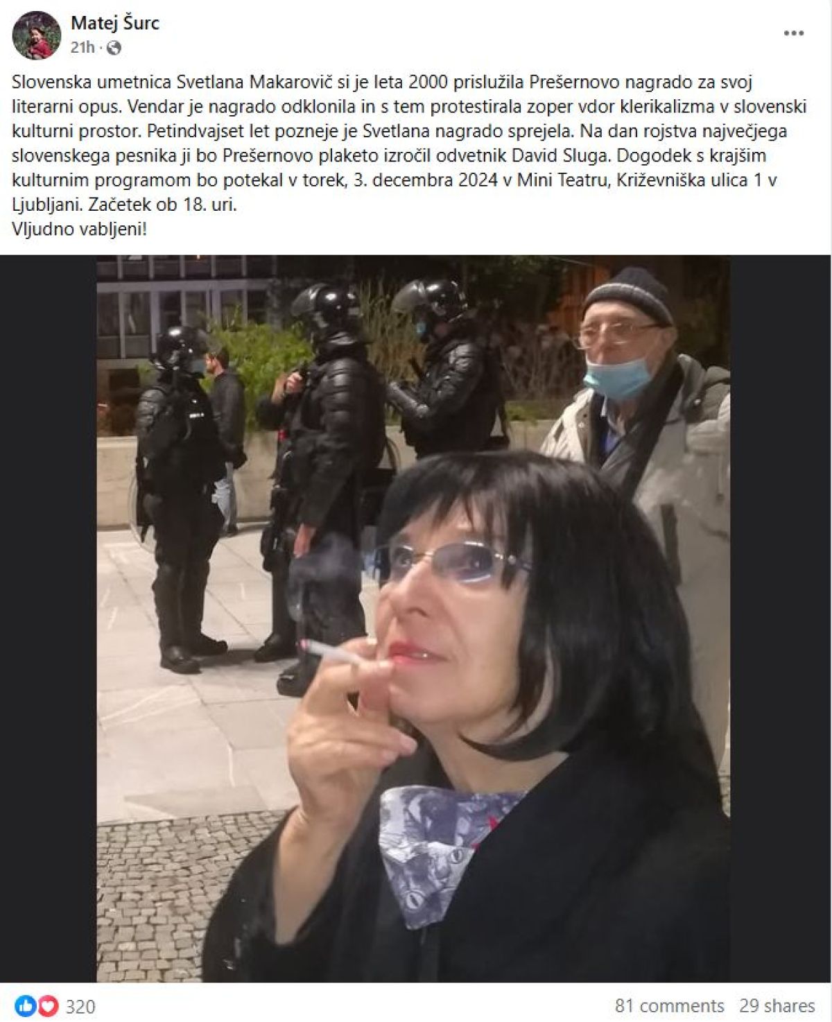 »Na dan rojstva največjega slovenskega pesnika ji bo Prešernovo plaketo izročil odvetnik David Sluga. Dogodek s krajšim kulturnim programom bo potekal v torek, 3. decembra 2024 v Mini Teatru, Križevniška ulica 1 v Ljubljani. Začetek ob 18. uri,« je na facebooku v vabilu javnosti zapisal novinar Matej Šurc, z Makarovičevo soavtor njene biografije Luciferka.
