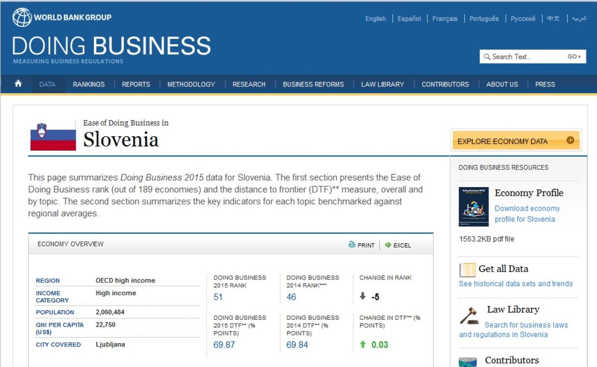 Slovenija je letos na lestvici Svetovne banke o pogojih poslovanja med 189 državami na svetu zasedla 51. mesto. To je pet mest slabša uvrstitev, kot jo je Slovenija po popravljenih podatkih zasedla lani. Na prvem mestu ostaja Singapur, sledita mu Nova Zelandija in Hongkong, je razvidno iz raziskave Doing Business 2015. Celotno poročilo Svetovne banke o Sloveniji s klikom na povezavo.