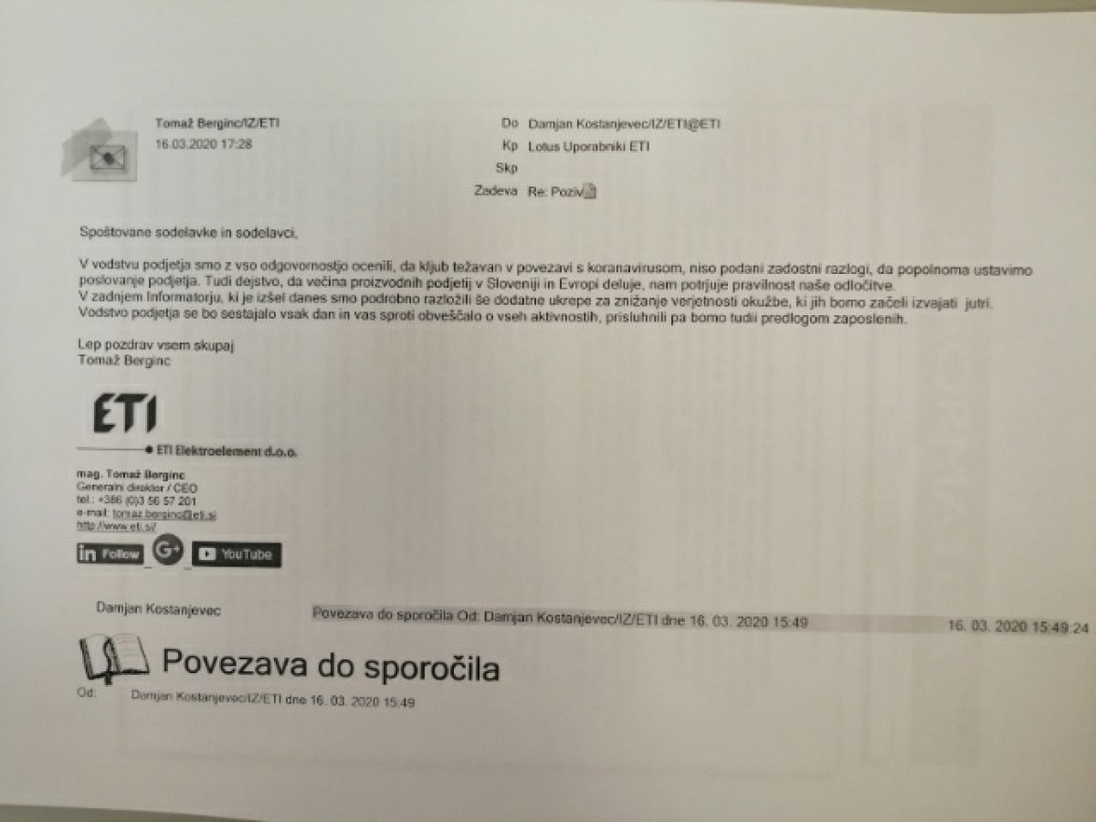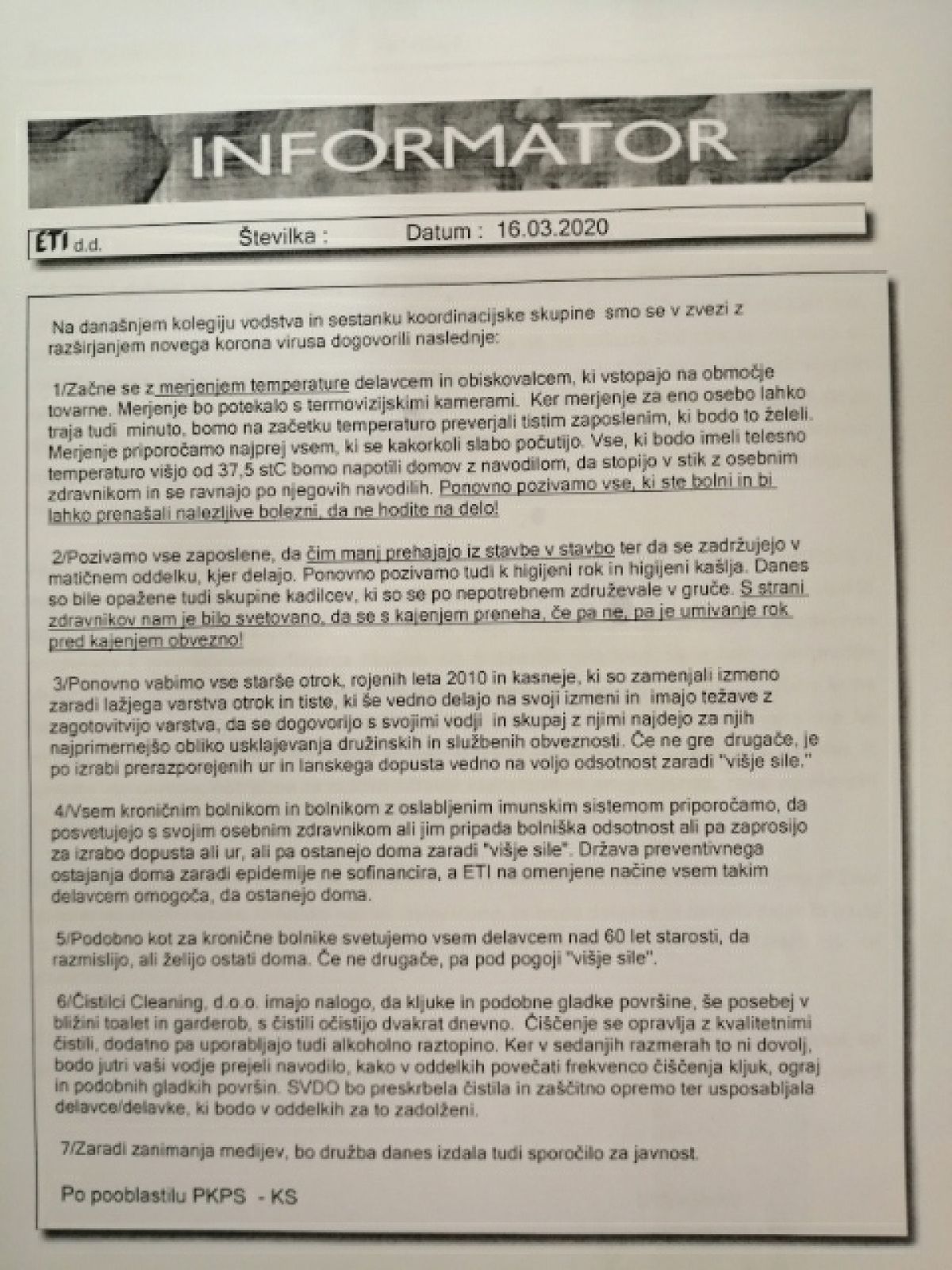 Nekaj ur po našem članku smo objavili tudi odziv vodstva podjetja ETI, mag. Tomaža Berginca, kjer je zapisal, da bodo s proizvodnjo nadaljevali in dopisal, da bodo in so sprejeli nekaj dodatnih ukrepov. Poglejmo, kakšno sporočilo je danes zaposlene pričakalo na vidnih mestih.