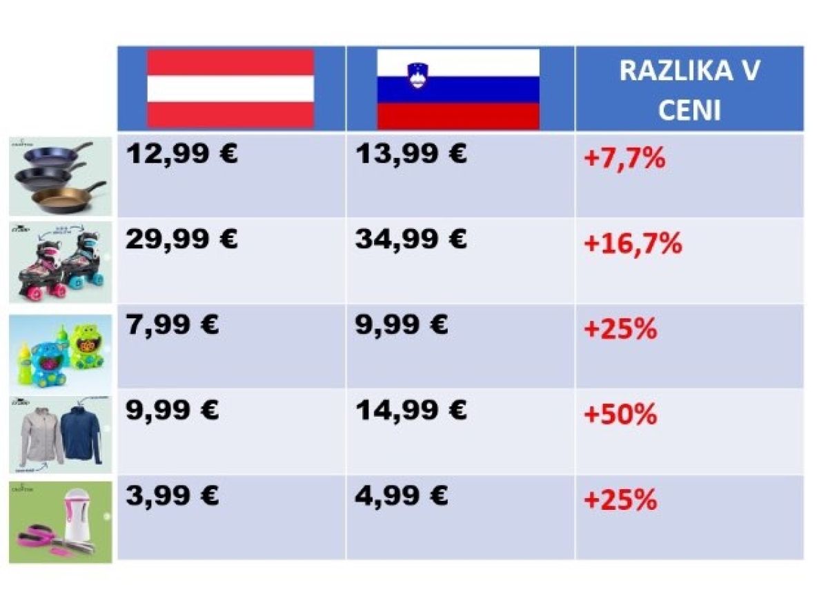 Nekateri izdelki v Jančevi primerjavi stanejo občutno več kot v Avstriji, čeprav je kupna moč naših sosedov precej višja. Ženske in moške športne jopice Crane so denimo v Sloveniji (14,99 evra) kar pol dražje kot v Avstriji (9,99 evra). Žaga Ferrex stane v Sloveniji 119 evrov, v avstrijskem Hoferju pa 99 evrov. Podobno je še v nekaj primerih.