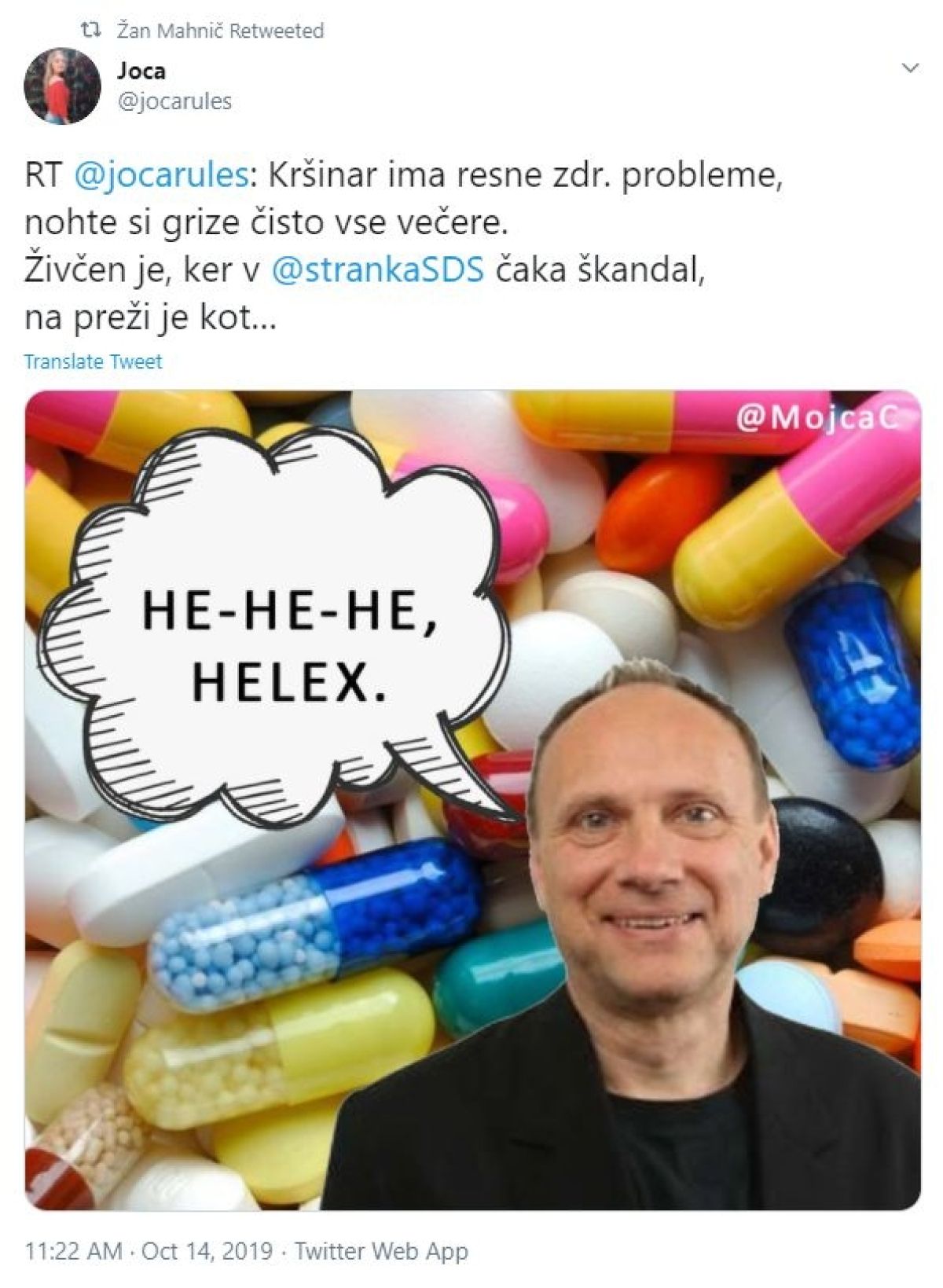 Takratni poslanec SDS Mahnič, ki je po izvolitvi tretje vlade Janeza Janše postal državni sekretar v kabinetu predsednika vlade, je že dan prej delil (retvital) tvit anonimnega uporabnika oziroma uporabnice z imenom Joca, ki je o meni napisala pesmico in ob moji sliki priložila vrsto tablet s pripisom He-he-he, helex. Glede na to, da tvite tako imenovane Joce Mahnič večkrat deli, gre zelo verjetno za nekoga iz podmladka SDS.